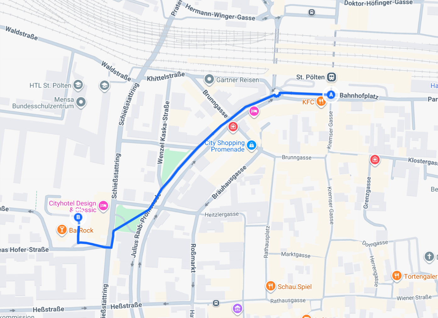 Vom St. Pöltner Hauptbahnhof erreichen Sie das Cityhotel D&C in nur etwa sechs Gehminuten. Der Weg führt Sie entlang der Julius-Raab-Promenade, einer Allee mit schattigen Bäumen und breiten Gehwegen. Nach einem kurzen Abschnitt durch den Willi-Gruber-Park hinter der Aquacity überqueren Sie die Straße – und schon stehen Sie direkt vor dem Haupteingang der Location.